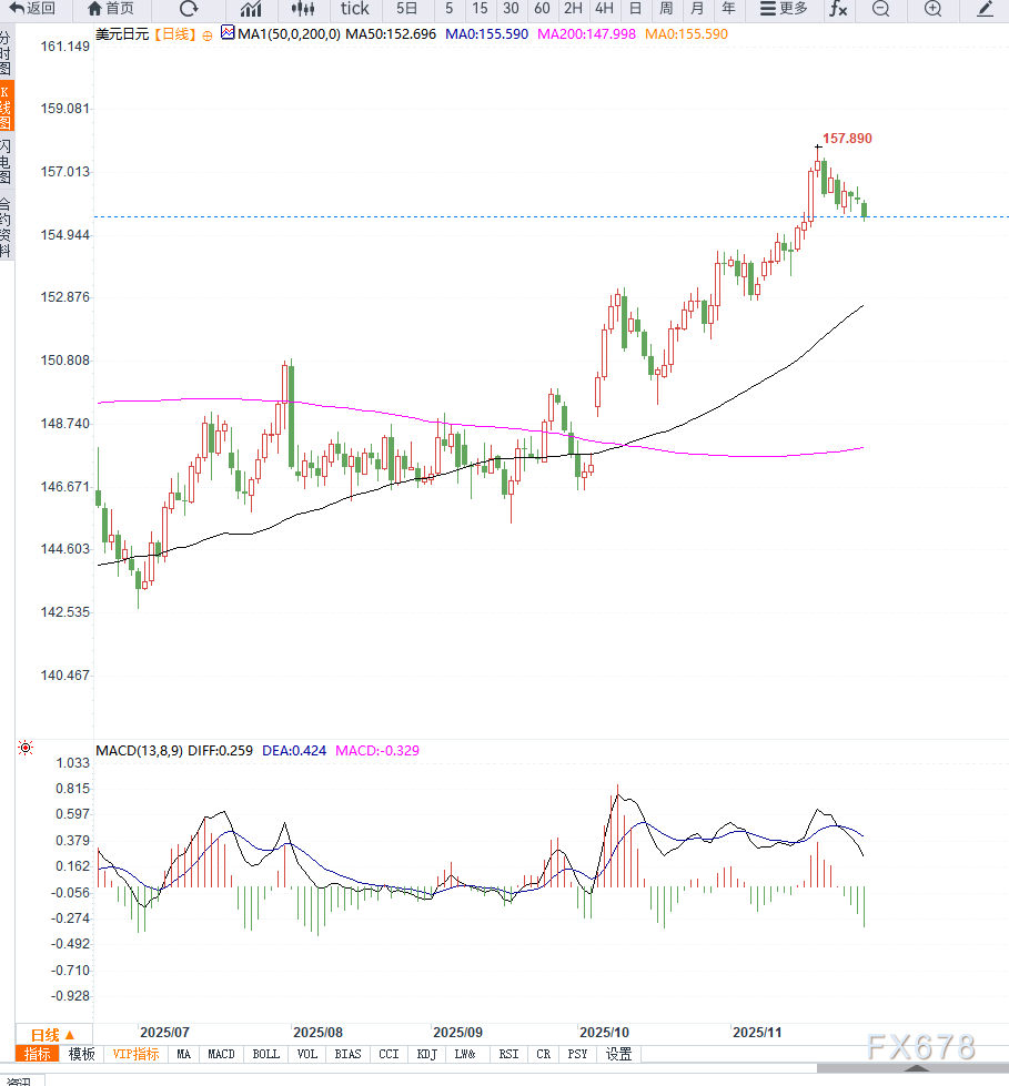 反之,若汇价在此支撑企稳,短线或展开技术性反弹,首先面临156.00整数关口压力,突破后可能上行至156.65-157.00区间,进一步挑战157.50及11月多月高点158.00。RSI指标处于中性略偏强区域,表明短线震荡中多空力量胶着,但整体仍偏向多头。