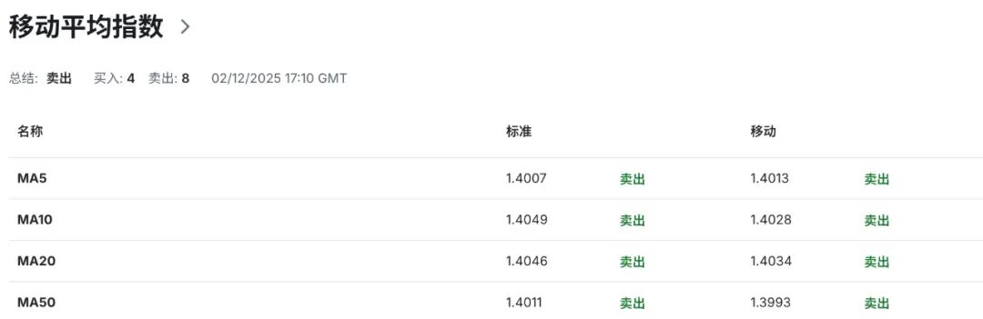 技术指标显示,日线级别布林带上轨切入点指向的1.4130区域水平为汇价提供短期动态阻力,布林带中轨运行线指向1.4040区域水平为其走势界定潜在强弱分化,布林带下轨指向的1.3955区域水平为汇价提供短期动态支撑。当前汇价趋向于测试布林带下轨区域,显示空头动能占据主导优势。布林带开口未呈现明显扩张迹象,表明短期波动率保持相对平稳。与此同时,14日RSI相对强弱指标降至44.50附近偏弱区域,表明当前价格走势处于偏弱格局,汇价下行风险加剧。