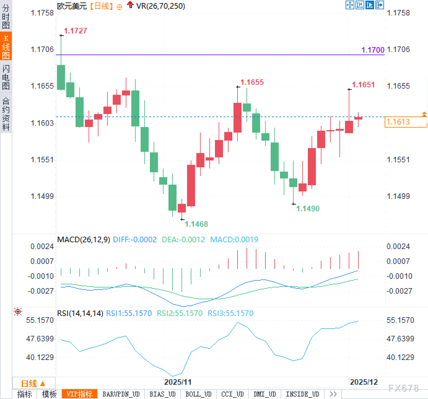 周二(12月2日),欧元兑美元汇价在北美时段维持窄幅震荡格局,现报1.1613,较周一自1.1650区域回落后企稳。欧元区通胀意外升温与失业率攀升形成矛盾信号,而美元在避险情绪支撑下暂获喘息,多空双方在关键技术位展开拉锯。