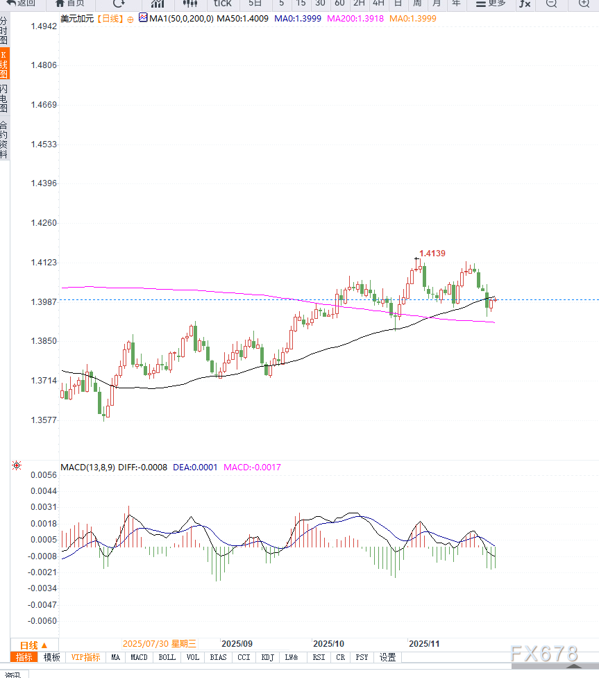 美元兑加元的走势目前主要受“政策预期差”推动——即美国降息节奏与加拿大经济韧性的相对变化。虽然美国数据整体偏弱,但美元仍具备阶段性反弹动能。