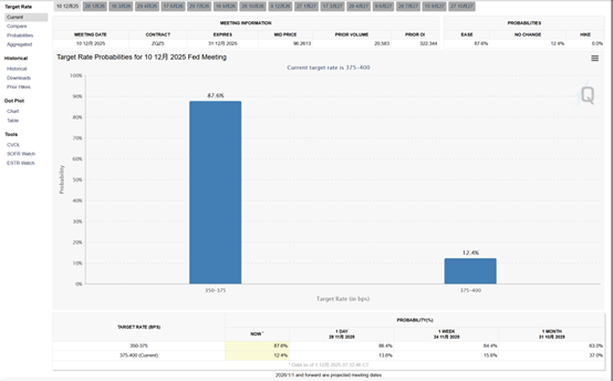 美联储定于12月9日和10日举行下一次政策会议。CME“美联储观察”,眼下美联储12月维持利率不变的概率为12.4%,降息25个基点的概率为87.6%。