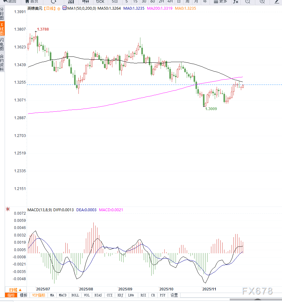 从日线图来看,GBP/USD目前保持在短期均线上方运行,多头动能占优。关键技术指标显示:价格站稳1.3200附近支撑区,形成稳固下方底部;短期阻力位在1.3280,若日线有效突破该区域,多头有望进一步冲击1.3300心理关口;