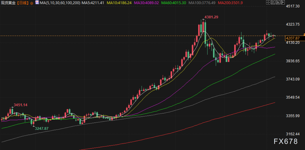 截至收盘,现货黄金微涨0.1%,报每盎司4210.49美元。价格走势平静,主要因美债收益率上升带来的压力,与美元走软提供的支撑相互抵消。美元指数跌至一个月低点,使以其他货币计价的黄金更便宜,但指标10年期美债收益率上涨,增加了持有黄金的机会成本。