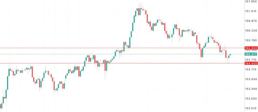 受日本央行加息预期升温影响,周四交易时段美元兑日元回落,日内最高触及155.54水平,尾盘最低测试154.50水平。