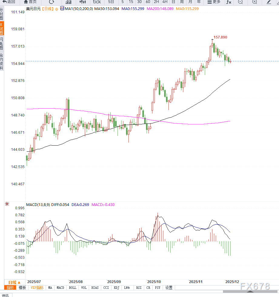 上方第一个关键阻力为 155.70(100小时均线),其次是 156.00。若多头成功收复该区域,将触发空头回补,使价格有望上探 156.60 区域,并进一步指向 157.00 与 157.50,最终可能再度测试 158.00 的强阻力。