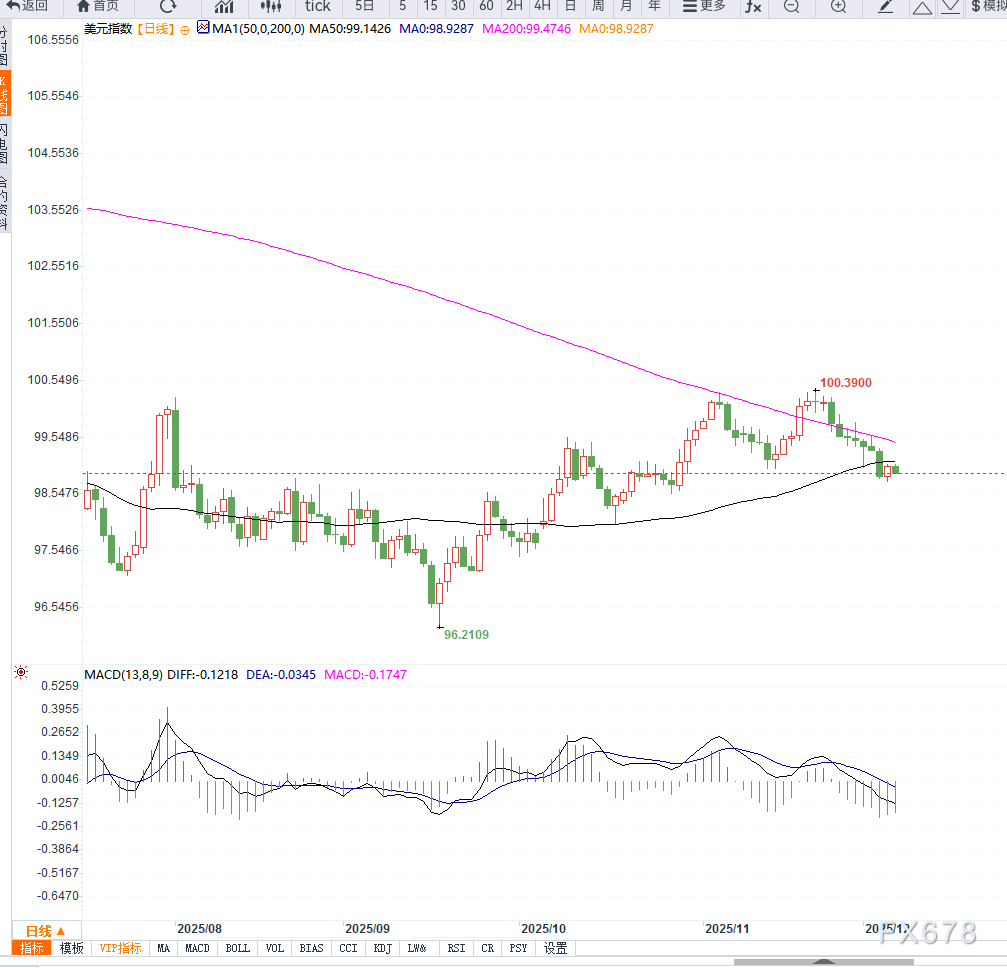 在政策路径偏松的背景下,美元吸引力持续减弱,使得投资者倾向逢高抛售。美元指数目前已连续第二周收跌,结构性压力正在积聚。在缺乏强劲利好因素之前,任何技术性反弹都可能被卖盘压制。从日线级别来看,美元指数近期呈现标准的弱势结构:指数持续运行在 100日与200日均线下方,表明中期趋势偏空。MACD动能柱维持在零轴下方,显示空头力量仍占主导。