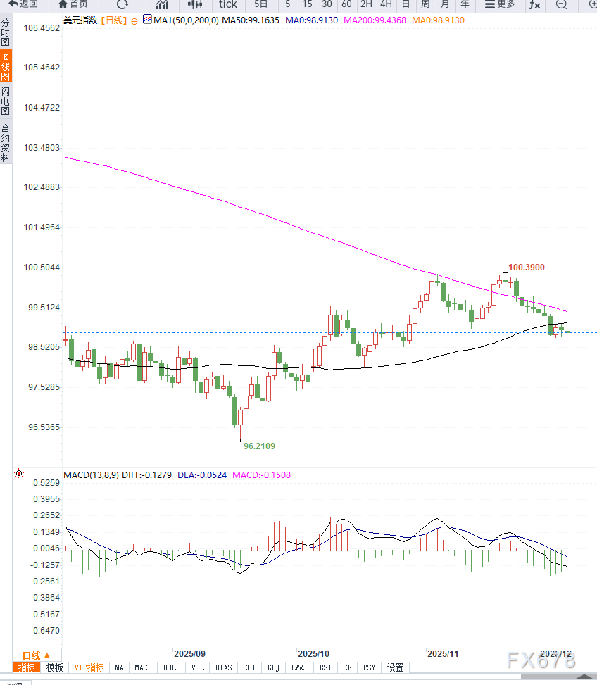 总体而言,当前美元走势主要受政策预期驱动,而经济数据的改善暂不足以扭转大方向。随着市场对降息的押注不断升温,美元指数短期可能继续维持弱势格局。从美元指数的日线级别走势观察,DXY近期持续运行在下降通道内,技术面结构呈现弱势震荡下行的特征。短期均线持续压制指数反弹,而MACD动能柱保持在零轴下方,显示空头力量仍占主导。