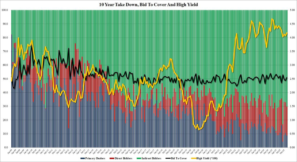 (2009–2025年美国10年期国债拍卖结构与需图,柱状图为三类买家认购占比,黑线为投标认购倍数,黄线为最高中标利率)
