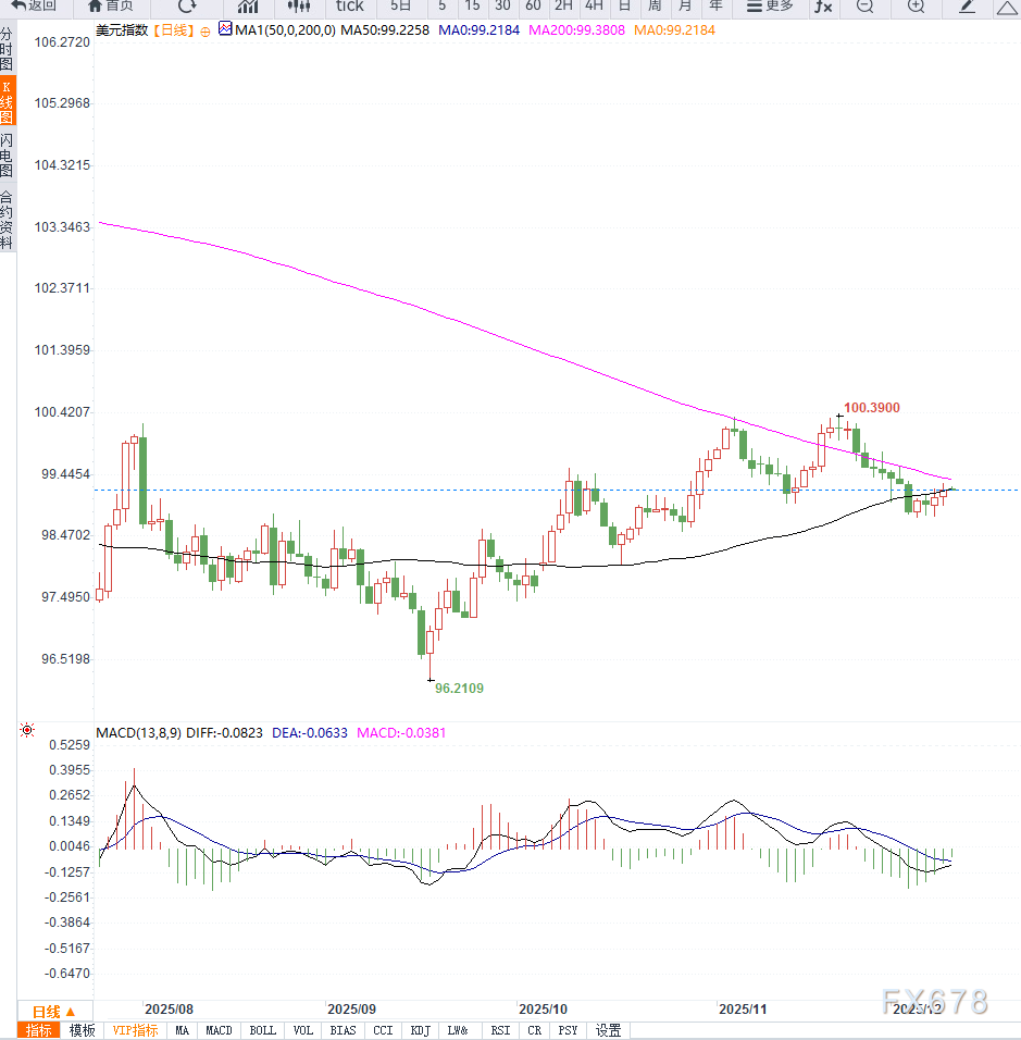 从美元指数日线结构来看,整体仍处于“弱反弹后的区间整理”格局,技术面呈现偏弱震荡的特点。DXY在连续跌破短期均线后虽有小幅反抽,但始终难以站稳在关键均线之上,显示上方卖压依旧强烈。