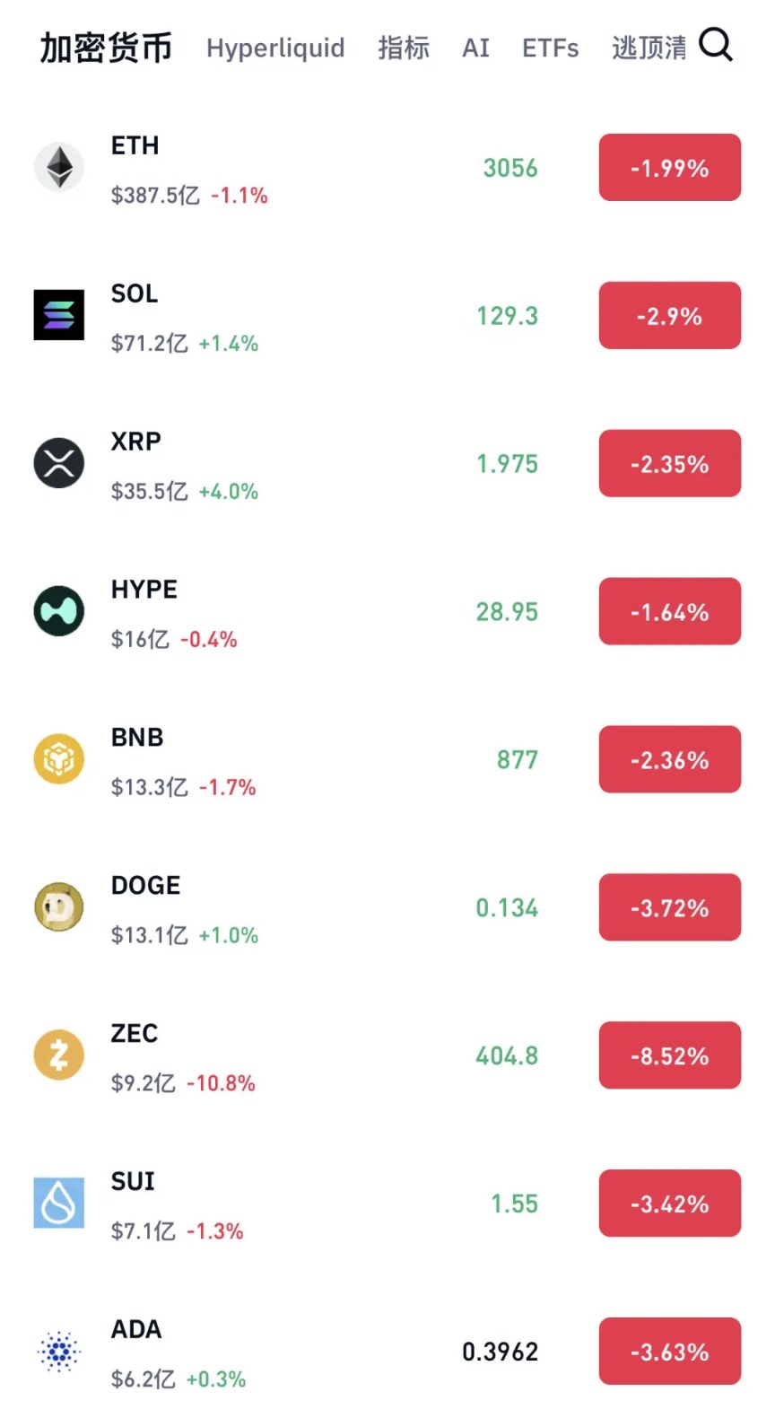 除了比特币,以太坊跌1.99%,SOL币跌2.9%,XRP币跌2.35%,狗狗币跌3.72%,ADA币跌3.63%。