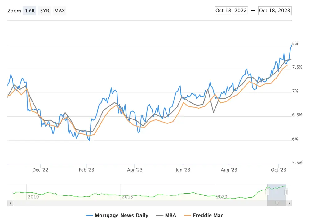 在经济的某些领域,人们已经敏锐地感受到收益率上升和借贷成本上升。30年期固定抵押贷款利率本周刚刚达到8%,这是自2000年以来的首次。过去一年抵押贷款利率稳步上升,使美国房地产市场陷入瘫痪状态,交易量降至13年来的最低点。