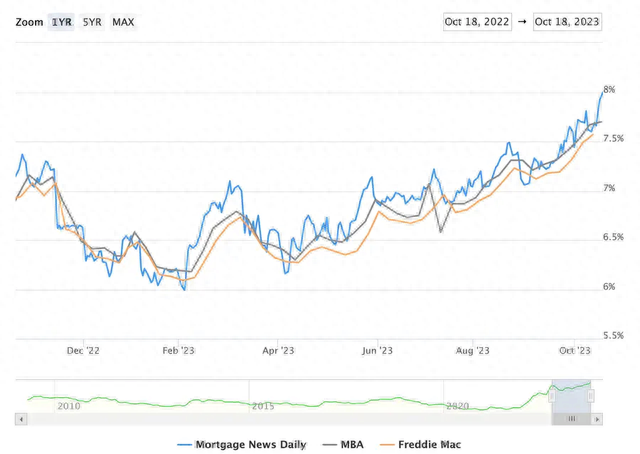 在经济的某些领域,人们已经敏锐地感受到收益率上升和借贷成本上升的影响。30年期固定抵押贷款利率本周刚刚达到8%,这是自2000年以来的首次,过去一年稳步上升至这一水平,使美国房地产市场陷入瘫痪状态,交易量降至13年来的最低点。