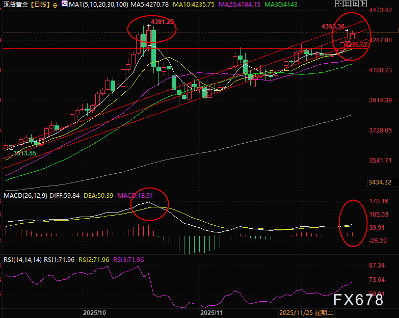 周一(12月15日)黄金(XAU/USD)正处于历史高位附近的强势震荡格局,美联储货币政策的不确定性、地缘政治风险发酵、各国央行持续购金及黄金ETF资金净流入,共同构成金价的核心支撑。当前金价交投于4339美元附近,距离10月20日创下的4381美元历史峰值仅差42美元,虽然技术面依然面临MACD背离。对于交易员而言,本周美国经济数据密集窗口期的开启,将成为左右金价短期波动的关键催化剂。
