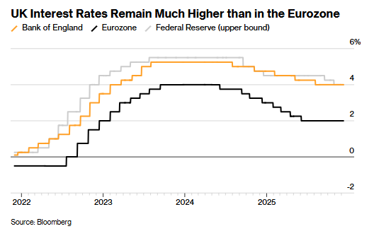 摩根士丹利、凯投宏观等机构的分析师认为,经济前景的持续恶化将倒逼政策制定者进一步降息。接受一项调查的经济学家预计,英国央行基准利率将在明年下半年降至3.25%。相比之下,投资者的预期更为悲观,他们押注最终的基准利率将稳定在3.4%左右。这意味着,若英国央行下周如期降息,那么政策制定者仅剩余一次25个基点的降息空间——若再进一步降息,就可能面临刺激通胀反弹的风险。