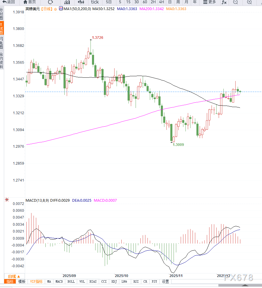 从日线图形上来看,维持中期震荡偏多,价格保持在200日均线支撑上方;200日SMA关键支撑在1.3350区间,短期均线略向下倾斜,形成下行压力;下方支撑关注200日均线及1.3325,进一步支撑在1.3300附近;上方阻力关注1.3385及1.3420区域;
