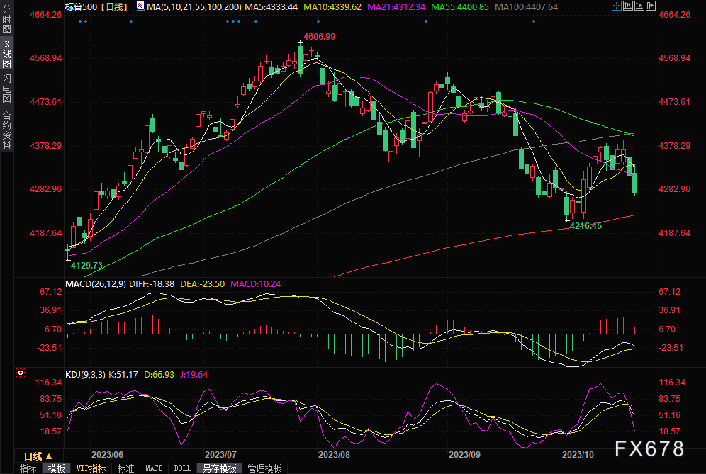周四(10月19日),在鲍威尔试图为美联储保留各种灵活性的讲话结束后,三大股指下跌,同时10年期美国国债收益率触及16年高位。截至收市,道琼斯指数10月19日收盘下跌250.91点,跌幅0.75%,报33414.17点;标普500指数10月19日收盘下跌37.25点,跌幅0.86%,报4277.35点;纳斯达克综合指数10月19日收盘下跌128.13点,跌幅0.96%,报13186.17点。