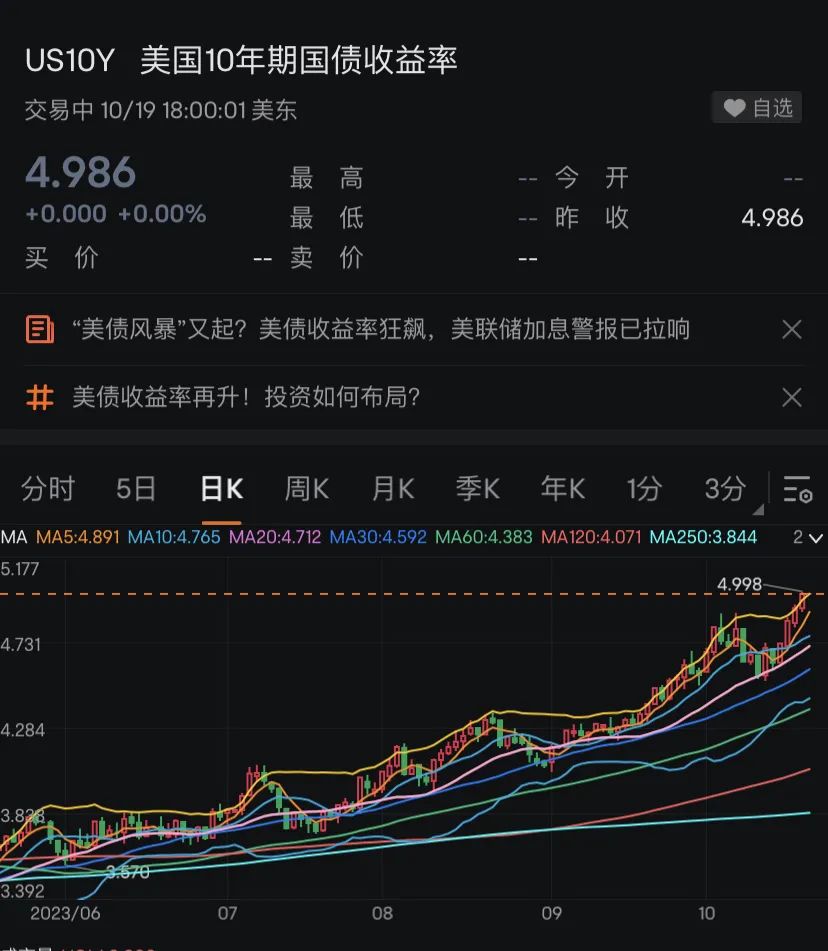 当地时间10月9日,美国10年期基准国债收益率向5.0%冲击,连续两日创2007年7月以来盘中新高,日内升近8个基点。