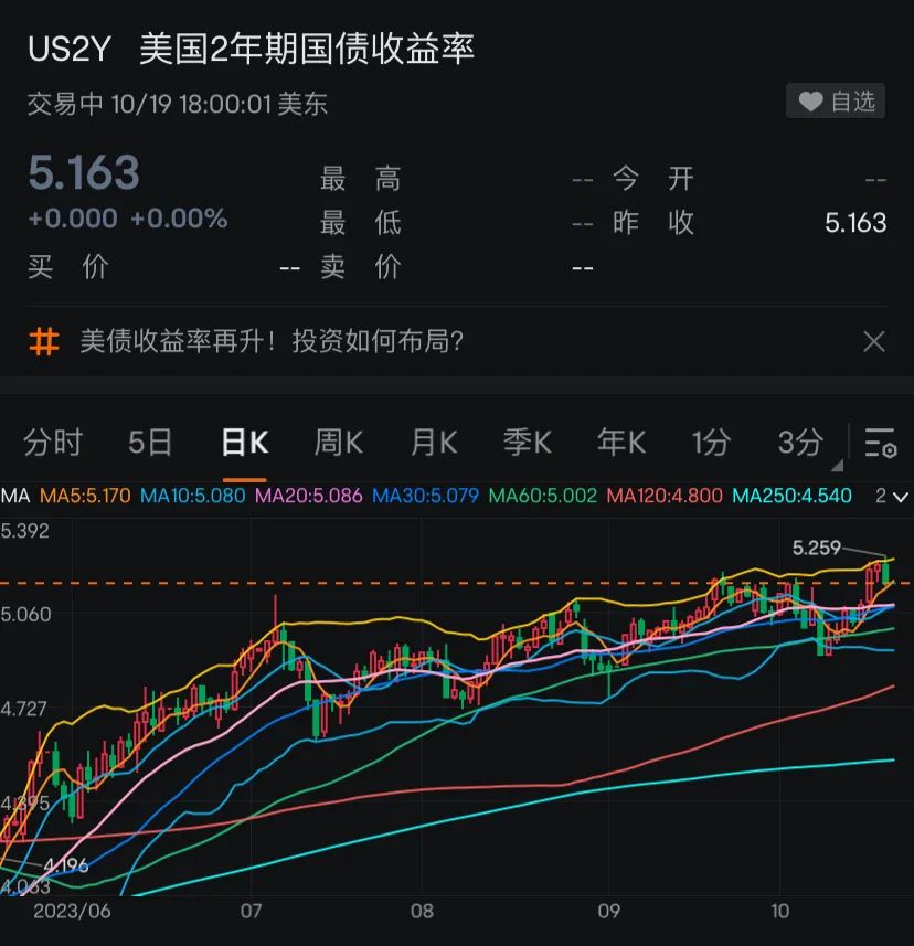 对利率前景更敏感的2年期美债收益率在盘中曾接近5.26%,连续三日创2006年来新高,日内升约3个基点。