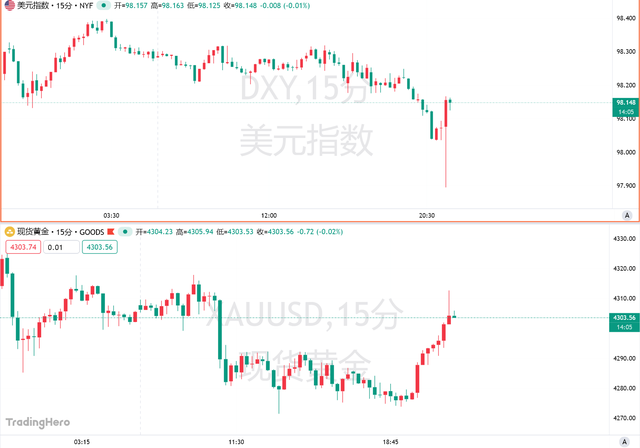 美元指数闻讯跌破98,为10月6日以来首次,随后迅速反弹。现货黄金短线上扬,一度回升至4310美元/盎司上方。非美货币对走高,欧元兑美元上扬10余点;英镑兑美元上扬近20点;美元兑日元下挫30点。