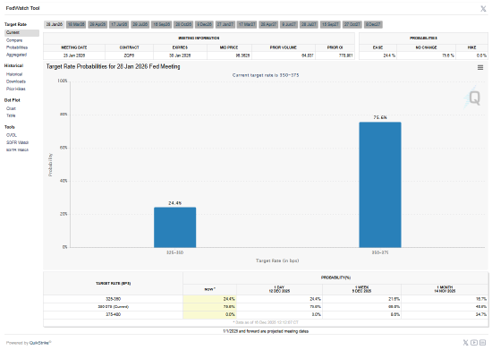 这份数据不仅决定美元短线方向,更可能影响美联储 2026 年政策路径。目前 CME FedWatch 显示,市场押注 2026 年 1 月降息概率高达 75.6%,明显高于美联储自身预测。若非农强劲,降息预期将被压制,美元可能反弹至 99 附近,黄金或面临回调压力;若数据疲弱,则会明显强化宽松预期,为金价重启上攻提供条件。