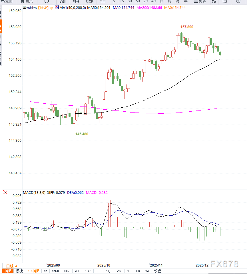 只有在突破上述阻力后,价格才可能进一步挑战156.00附近的100小时均线。总体而言,技术指标在小时图和日线层面均偏向空头,配合基本面的政策预期分化,美元兑日元短期仍面临下行压力。