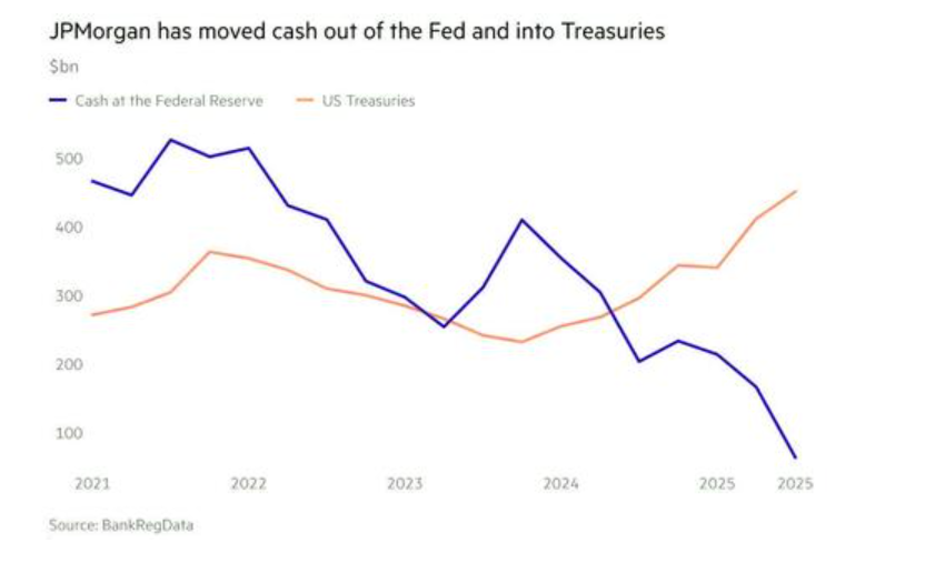 据行业数据追踪机构BankRegData汇编的最新数据显示,自2023年底以来,摩根大通已将其在美联储的存款余额从4090亿美元大幅削减至今年第三季度的630亿美元,提取了近3500亿美元。与此同时,该行在同一时期内持有的美国国债规模从2310亿美元激增至4500亿美元。