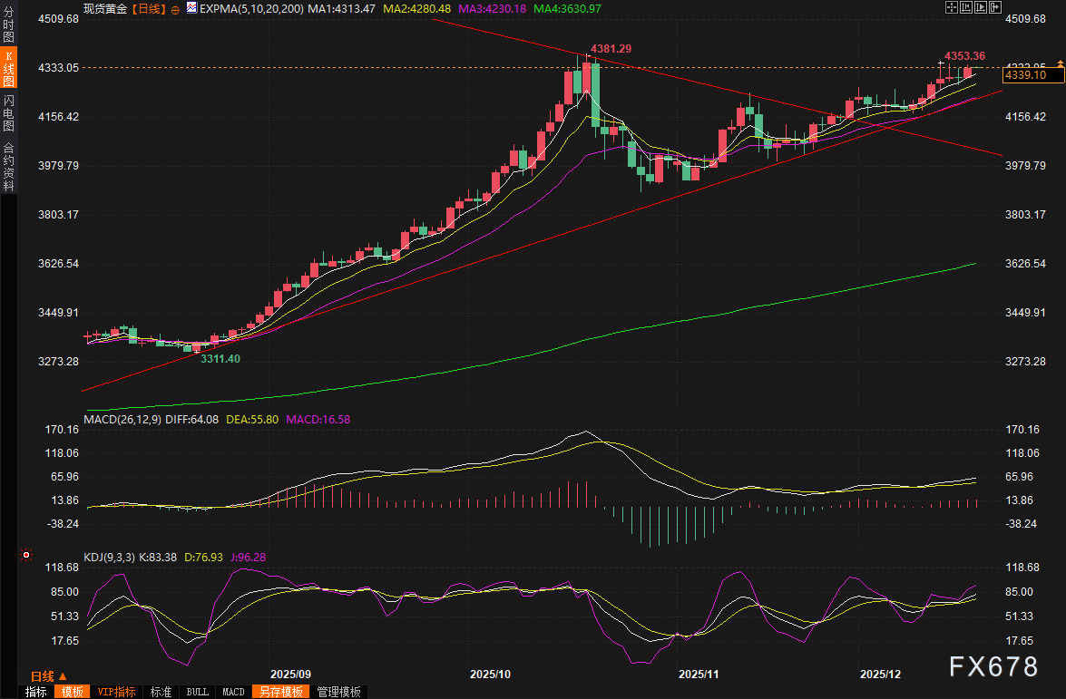 在2025年年末的全球金融市场中,黄金价格犹如脱缰野马般强劲上扬,受到美国就业数据疲软、美联储降息预期重燃以及地缘政治紧张局势升级等多重因素的合力推动,周三(12月17日)现货黄金价格继续攀升,盘中最高曾触及4348.70美元/盎司,收报4338美元/盎司附近,涨幅接近1%。与此同时,白银价格更是突破66美元大关,创下历史新高66.88美元/盎司,铂金也触及逾17年最高点。周四(12月18日)亚市早盘,现货黄金窄幅震荡,目前交投于4340美元/盎司附近,本交易日重点关注特朗普的全国讲话和延迟公布的美国11月CPI数据。