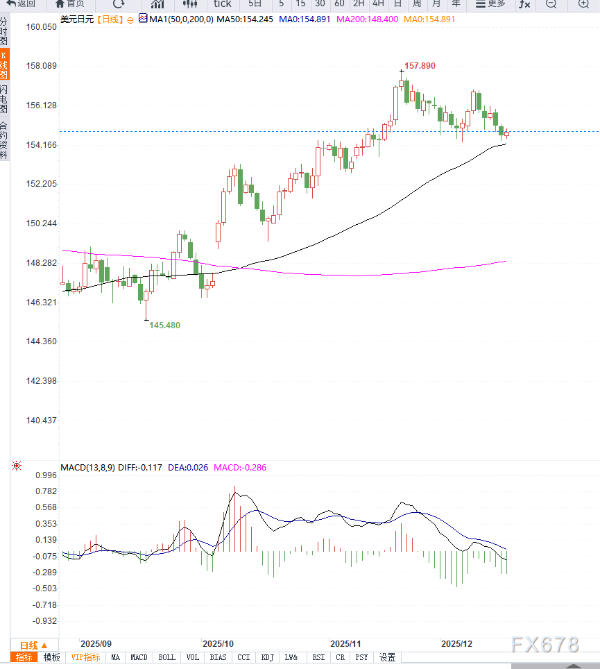 美元/日元短期走势呈现承压整理特征。市场对BoJ加息的预期支撑日元,而美国劳动力数据疲软及美联储潜在降息预期限制美元反弹。关注本周BoJ会议及美国通胀数据,短期154.35–155.25区间震荡为主,突破任一关键位都可能引发新一轮方向性波动。