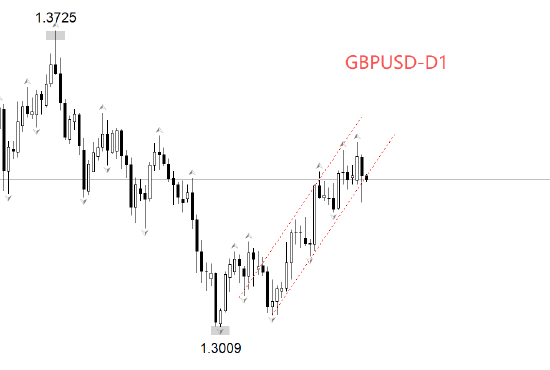 行情方面,日线级别,GBPUSD处于中期震荡状态,震荡的起始日期约为5月12日。在这一轮持续超半年时间的震荡过程中,GBPUSD最高触及1.3787点,最低触及1.3009点,区间778点,属于宽幅震荡。如上图所示,1.3725是中期高点,1.3009是中期低点,1.3009之后的上涨行情,是在寻找新的中期高点。考虑到中期走势为震荡,所以前一个中期高点1.3725有可能成为当前上涨波段的阻力位。另外,最新上涨波段运行于图中上升通道内部,一旦有连续的K线跌破通道下轨,意味着中期高点形成。中期高点形成后,新的下跌波段随之出现。