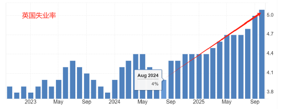 英国央行降息的主要压力来自于劳动力市场。英国央行政策制定者梅根格林本月初表示:“需要看到劳动力市场进一步恶化(才能支持降息)”。自2024年8月份以来,英国的失业率不断升高,从4%一路攀升至今年10月份的5.1%。上一次英国出现就业率在5%以上,还是在2021年5月份,也就是疫情期间。当前的失业率数据与疫情期间持平,足见英国的就业市场已经进入非常糟糕的局面。