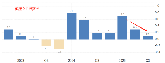 上图是英国季度GDP增速环比数据。2023年三季度和四季度,英国季度GDP连续下降。2024年至今的两年时间,GDP环比增速一直处于1%以下,最低达到今年三季度的0.1%。2024年一季度和2025年一季度的环比增速有所反弹,但随之而来的是连续多个季度的下降。GDP数据是宏观经济表现的最重要参考指标,环比增速的下降正在逼迫英国央行采取更加宽松的货币政策。