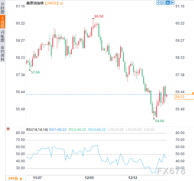 (美原油连续4小时图,来源:易汇通)北京时间14:24,美原油连续现报56.34美元/桶。