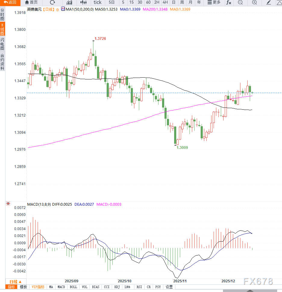 在这一背景下,英镑兑美元多空力量暂时趋于平衡,汇价更多呈现出区间整理特征,而非单边下行走势。从日线图来看,英镑兑美元近期延续弱势震荡格局。汇价自 1.3480 高点回落后,连续在 1.3310–1.3380 区间整理,显示多空力量暂时胶着。价格当前位于 20日与50日均线附近徘徊,短期均线呈现微向下倾斜,反映出下行压力仍在。