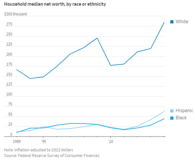 当然,贫富间巨大的差距依然存在。黑人家庭2022年的净资产中位数为4.49万美元,仍然低于其他族裔群体。同年,白人家庭的净资产中位数为28.5万美元,西班牙裔家庭的净资产中位数为6.16万美元。值得一提的是,亚裔家庭的净资产中位数高达53.6万美元(在今年的调查中首次单独测量)。