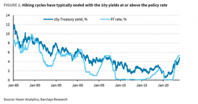 巴克莱指出,尽管市场弥漫着恐慌情绪,但债券收益率并不算特别高,美联储的政策也不像许多人认为的那样紧缩。尽管10年期国债收益率目前飙升至4.955%,但仍比美联储预期的5.45%的最终政策利率低约50个基点。
