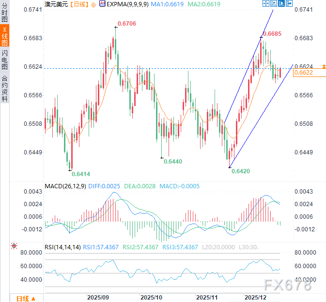 周一(12月22日)亚市时段,澳元兑美元震荡上涨,涨幅约0.24%,因澳洲联储鹰派预期提振与美元走低支撑。市场交易者或将重点关注即将于周二公布的澳洲联储会议纪要,以寻找澳洲联储政策前景及其对通胀压力评估的相关线索。
