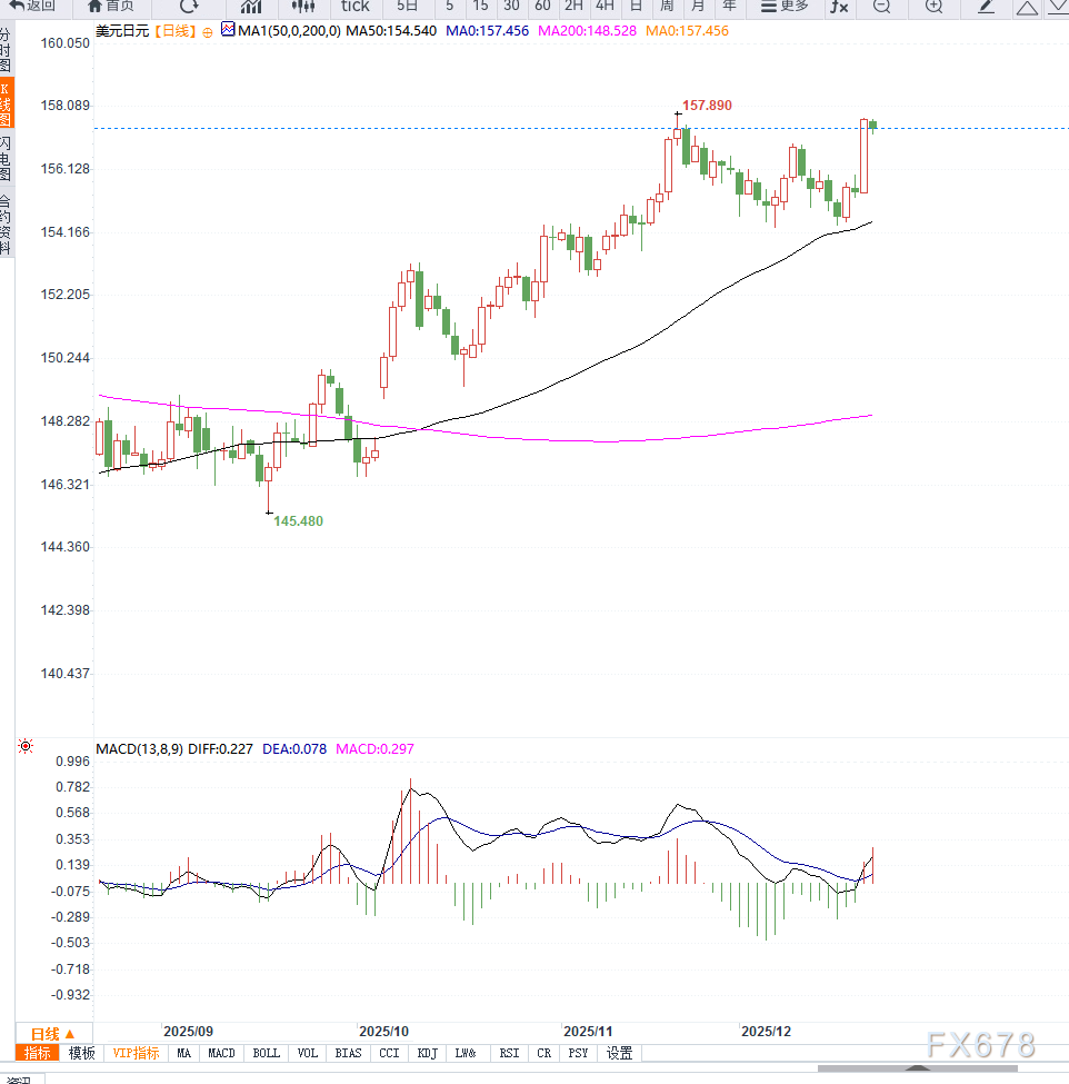 若出现进一步回落,下方关注155.50附近支撑,进一步是155.00心理关口,一旦跌破,短线趋势或转向偏空。上行方面,若汇价站稳157.90区域上方,或将打开指向158.45甚至159.00的上行空间。