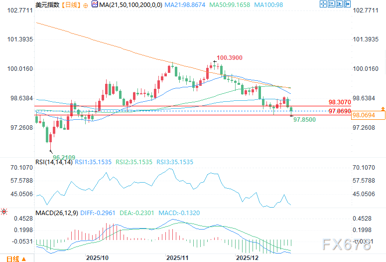 技术面显示,美元指数正处于关键决策区间。首次测试97.814时获得买盘支撑,表明市场存在逢低买入兴趣,但反弹在98.307下方遇阻,显示上行动能不足。在价格突破这两个关键点位之前,交易员更可能采取高抛低吸策略,而非追涨杀跌。若美元指数持续突破98.307,短期走势有望改善,市场焦点将转向98.591和98.749等前期高点。反之,若有效跌破97.814,止损盘可能被触发,加速美元指数下探97.462和97.199。在多空双方分出胜负前,技术面预示假日交投清淡期间,美元指数大概率维持区间震荡格局。