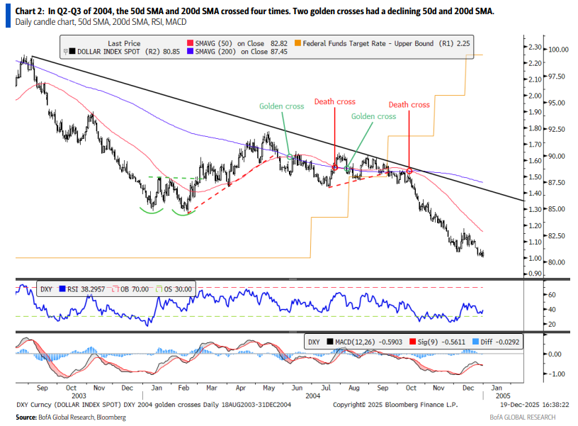 此次黄金交叉的特殊之处在于,50日和200日移动均线均处于下降趋势中。这种情况极为罕见,上一次出现在2004年。当时美元指数经历了约六个月的横盘整理,随后在美联储加息周期中于第四季度下跌。