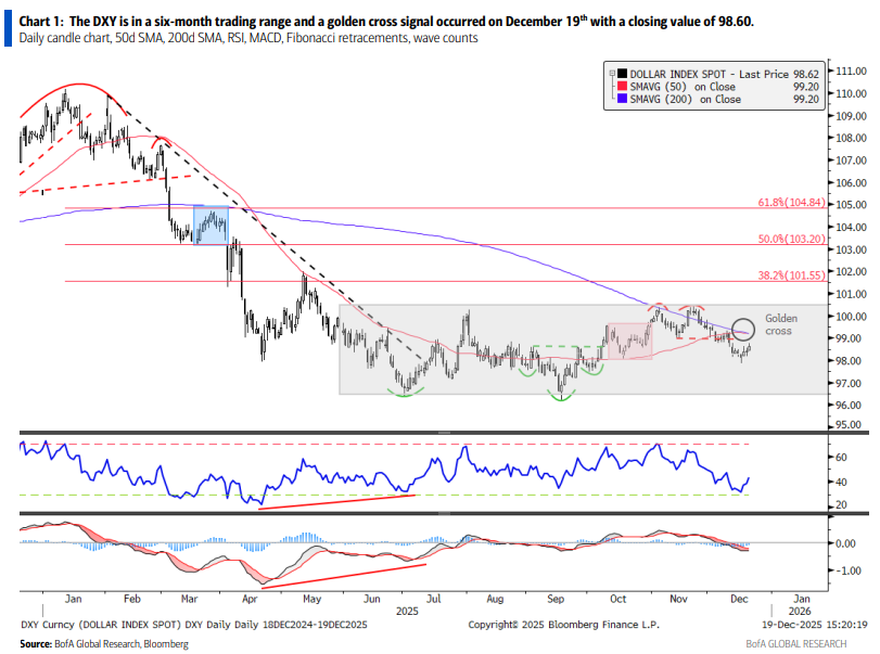 12月19日,美元指数收于98.60,美元指数50日移动均线上穿过200日移动均线,形成技术分析中的“金叉”信号。