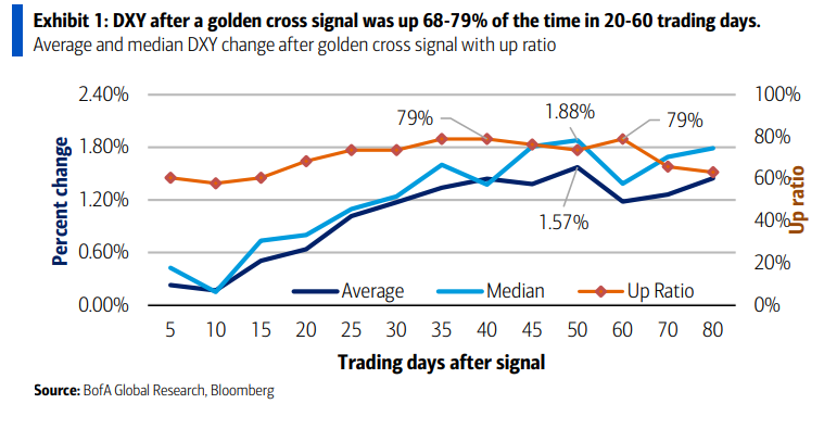 历史统计显示,金叉出现后,美元指数的表现呈现明显的上涨倾向。自1970年以来,美元指数共出现过38次此类信号,当前为第39次。美银美林报告显示: