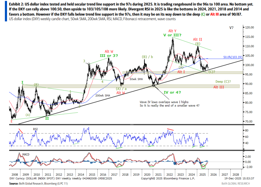 美银美林技术分析显示,当前美元指数正在测试97区域的长期趋势线支撑。如果跌破该支撑位,美元可能进一步下跌至90/87区域。