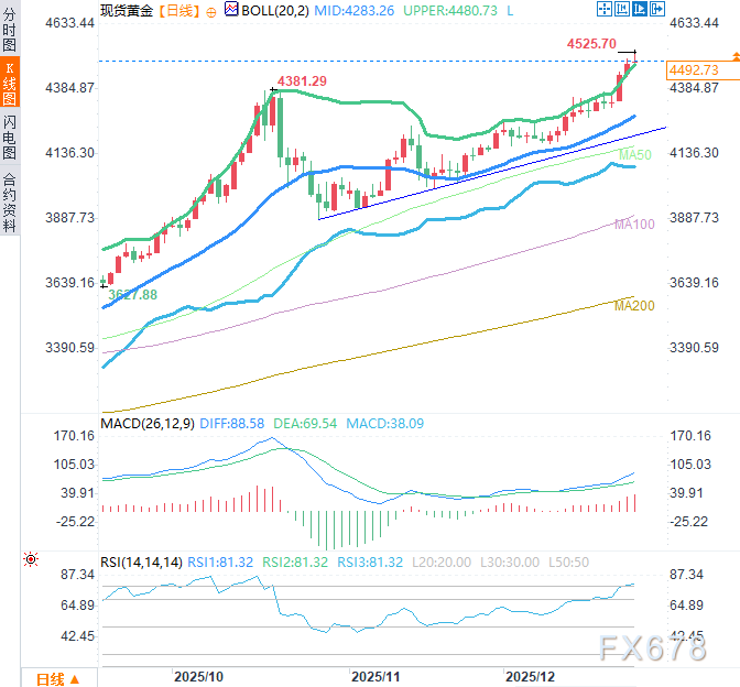 周三(12月24日)亚欧时段,现货黄金从每盎司4525.70美元的历史高点回落,因圣诞假期前夕,部分交易者获利了结。此外,美国乐观的国内生产总值(GDP)数据也可能对金价构成压力。