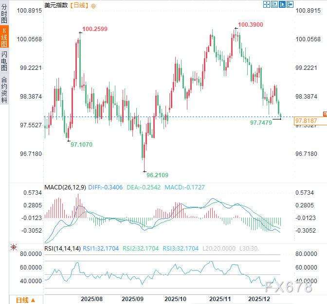 综合来看,基本面所揭示的政策方向——即政治力量推动美联储在经济表现良好时进行更快速、更大幅度的降息——对美元汇率的影响在短中期内偏向负面。主要传导路径是:政策不确定性上升→降息预期激进→美债利差优势收窄→美元资产吸引力下降。周三美元指数持续走低,创10月3日以来低点至97.74,市场普遍认为,美联储的独立性和以数据为依据的审慎货币政策是维持货币价值和信心的基石。政治力量若过度干预利率决策,会引发市场对美国货币政策信誉和可预测性的担忧。这种不确定性通常会削弱投资者对美元的信心,导致资本外流寻求更稳定的环境,从而给美元带来贬值压力。长期影响则取决于这一政策路径能否奇迹般地避免通胀反弹。若引发通胀或政策信誉持续受损,将对美元构成更深远的利空。当前市场已部分消化降息预期,但若未来美联储的人事任命和政策声明进一步强化“政治化”和“落后于曲线后急追赶”的叙事,美元可能面临新一轮的抛售压力。