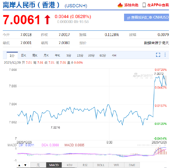 12月29日,人民币兑美元中间价报7.0331,上调27点。升值至2024年9月30日以来最高。