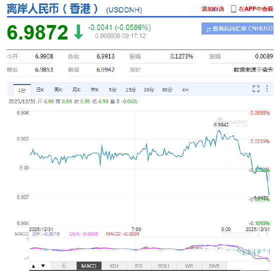 12月31日,人民币兑美元中间价报7.0288,上调60点。升值至2024年9月30日以来最高。离岸人民币升破6.99。
