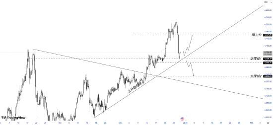 从技术结构看,黄金整体仍运行在清晰的中期上升趋势中。图表显示,金价自 11 月以来沿着上升趋势线稳步抬升,前期下行趋势线已被有效突破并转化为中期结构支撑,确认趋势由整理转为单边上行。近期金价在快速拉升后出现剧烈回调,但回落并未破坏上升趋势线,显示抛压更多来自高位获利了结,而非趋势性反转。目前市场正围绕关键支撑区间反复博弈。