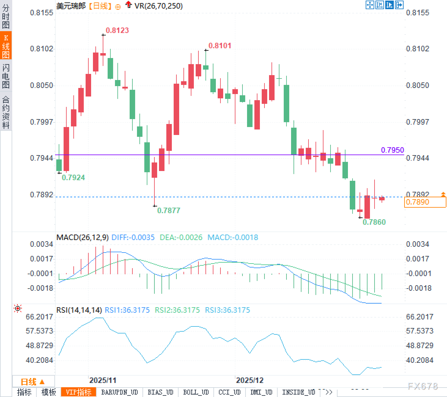 从日线蜡烛图结构看,美元兑瑞郎在冲高至0.8123后,整体进入下降趋势与反复回撤的组合。反抽的高点停在0.8101附近,未能形成更高高点,说明上方抛压与套牢盘仍在。随后汇价向下快速滑落,近期低点已下探至0.7860,短线空头市场情绪占优。