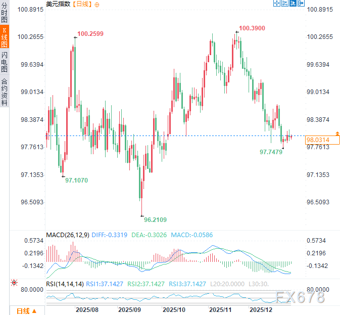 周二(12月30日)亚欧时段,美元指数于98.05附近窄幅震荡,接近三个月低点(97.75),货币市场正等待晚些时候美联储12月会议纪要的公布。