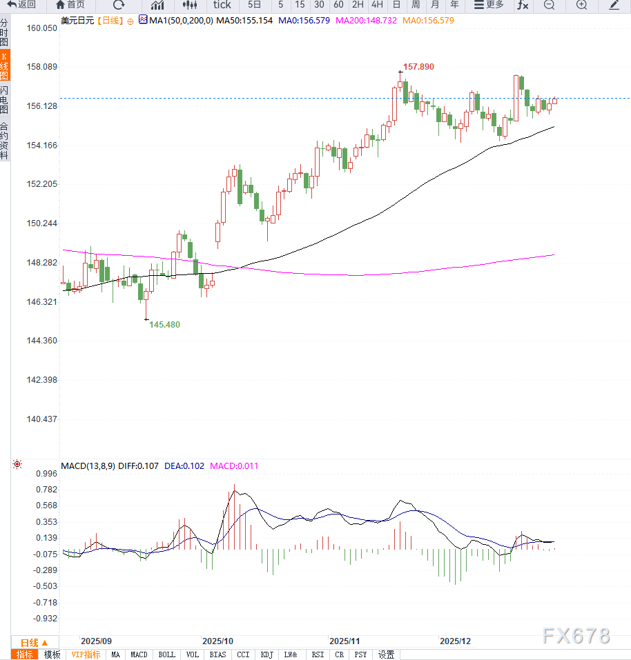 从日线图来看,USD/JPY呈现上升通道结构。价格稳守156.00关键支撑上方,短期均线(5日、10日EMA)向上排列,多头趋势明确。RSI指标约为62,显示上行动能仍在,但略接近超买区域。